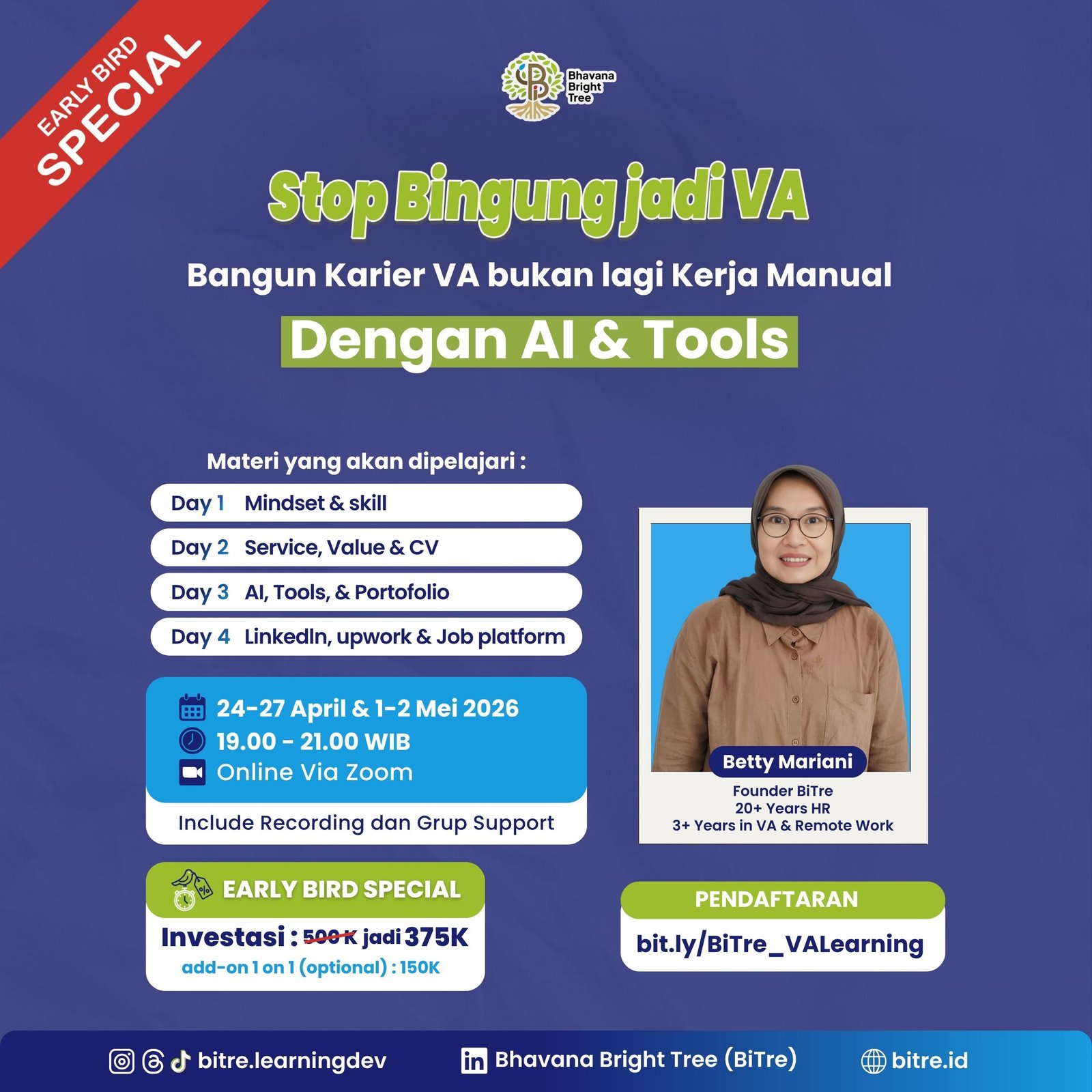 BiTre tidak mengajarkan “cepat dapat klien”, tapi membangun fondasi kerja remote yang profesional dan berkelanjutan.